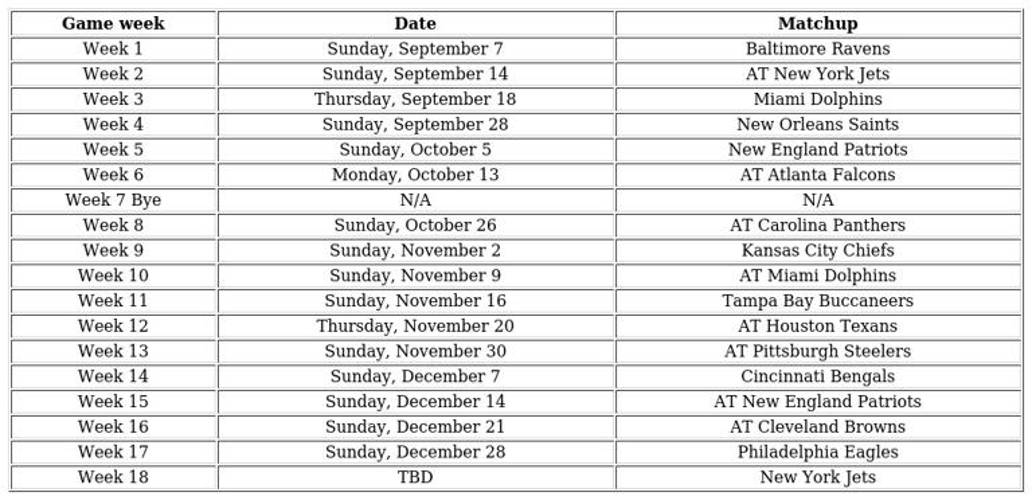 CBS dominates coverage, airing 8 games including pivotal divisional battles against the Jets, Dolphins (Week 10), Patriots (Week 15), and Buccaneers.