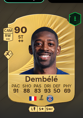 Ousmane Dembélé’s Gold Rare card stands out as a Striker with an impressive overall rating of 90, making him a formidable presence on the pitch. Boasting blistering pace at 91, exceptional dribbling at 93, and a strong shooting rating of 88, Dembélé is tailor-made for breaking through defensive lines and creating scoring opportunities. His passing rating of 83 ensures that he can link up play effectively, while his agility and speed make him a constant threat in attack. As a striker, these attributes allow Dembélé to quickly exploit gaps in the opposition’s defense, making him the perfect choice for players looking to seal the game with decisive goals.