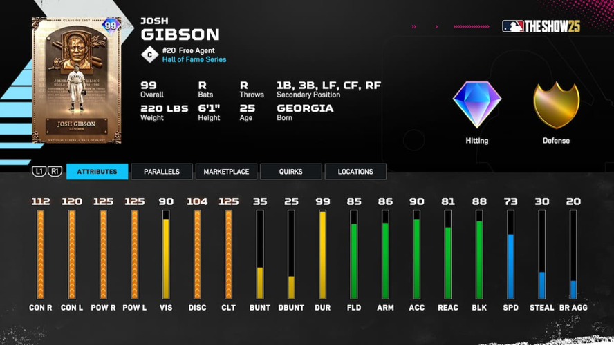 Among these, Josh Gibson stands out as a premier hitter and utility fielder, with outstanding stats such as 114 stamina, 100 hits per nine, and 103 strikeouts per nine. His batting attributes are impressive—112 contact vs. right-handed pitchers, 111 against lefties, and power ratings soaring at 125 for both sides.