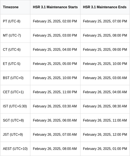 HSR 3.1 Maintenance Schedule