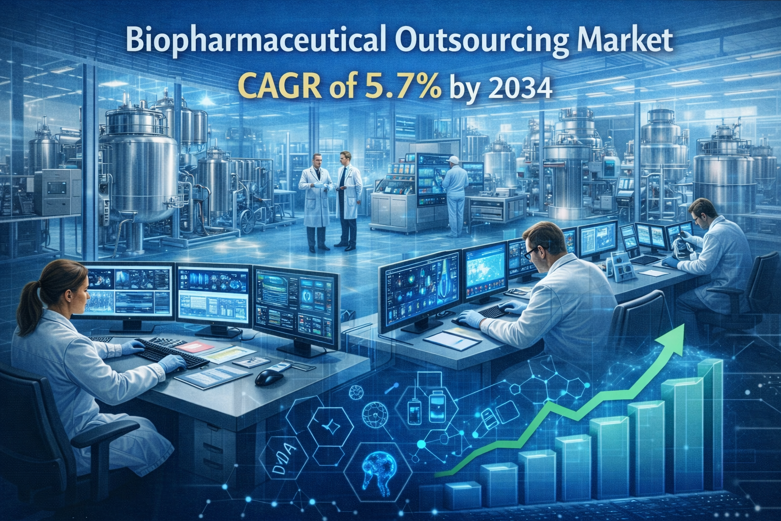 The Biopharmaceutical Outsourcing Market is projected to expand at a CAGR of 5.7% from 2026 to 2034, reflecting steady momentum driven by innovation, global demand for biologics, and strategic collaborations. As pharmaceutical pipelines become more complex, companies are increasingly turning to external service providers to enhance efficiency and manage development risks. The biopharmaceutical outsourcing industry landscape demonstrates stable progress supported by scientific advancements, regulatory evolution, and expanding therapeutic applications.