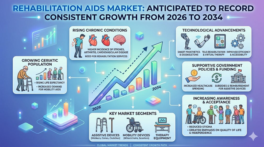 The Rehabilitation Aids Market Drivers are shaping industry expansion over the forecast period from 2026 to 2034. Factors such as technological innovation, growing awareness of rehabilitation therapies, and demographic trends are fueling the demand for high-quality assistive devices globally. These drivers enable better patient outcomes, encourage adoption, and create new opportunities for manufacturers and healthcare providers.