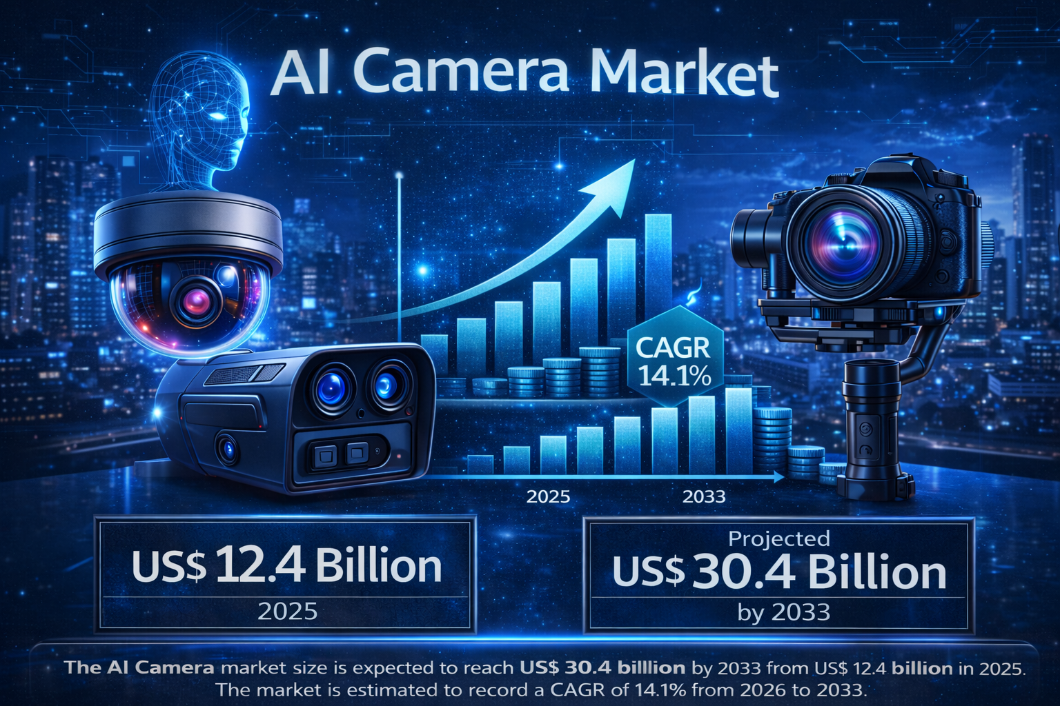 The valuation of the industry reflects a robust upward trend. According to recent market intelligence, the AI Camera market size is expected to reach US$ 30.4 billion by 2033 from US$ 12.4 billion in 2025. The market is estimated to record a CAGR of 14.1% from 2026 to 2033. This consistent growth rate is sustained by the continuous refinement of deep learning algorithms and the integration of AI in consumer electronics. The shift from traditional CCTV systems to AI-enabled IP cameras is particularly prominent in the commercial sector, where data-driven insights are used to optimize retail layouts and monitor workplace safety.