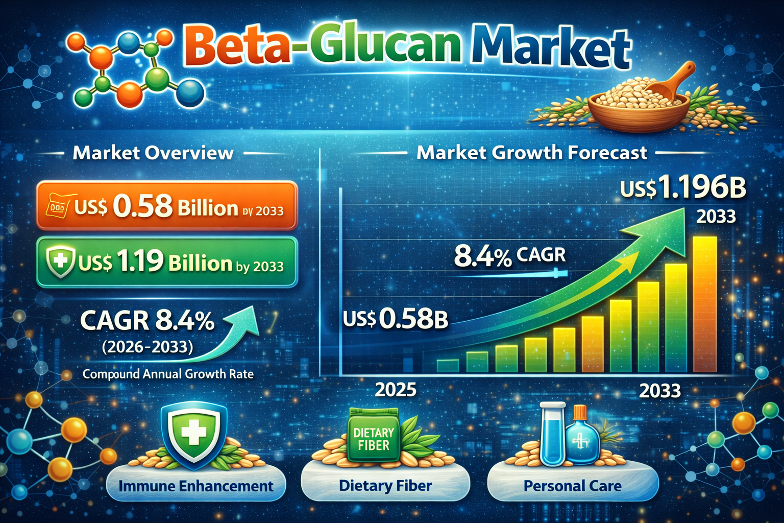 According to the latest market intelligence, the sector is poised for substantial financial appreciation over the next decade. The Beta-glucan Market size is expected to reach US$ 1.19 billion by 2033 from US$ 0.58 billion in 2025. The market is estimated to record a CAGR of 8.4% from 2026 to 2033.