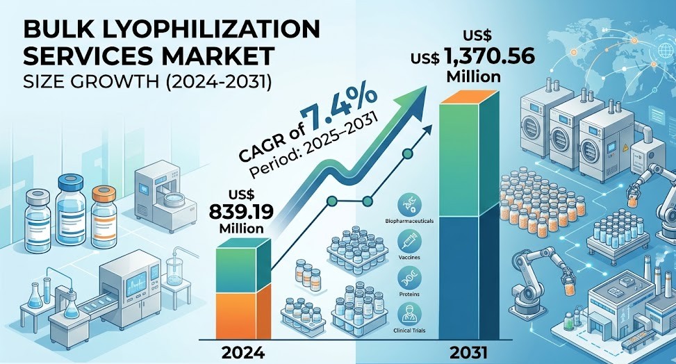 The Bulk Lyophilization Services Market Scope continues to expand significantly, supported by rising biologics demand and increased outsourcing to specialized service providers. The industry is projected to grow from US$ 839.19 million in 2024 to US$ 1,370.56 million by 2031, registering a CAGR of 7.4% during 2025 to 2031. This growth reflects the widening scope of services, technological innovations, and global adoption across pharmaceutical manufacturing processes.