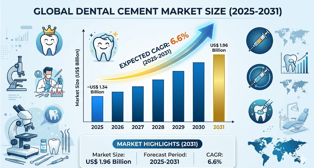 The Dental Cement Market Scope highlights a broad expansion across product types, material innovations, and end-user applications. The Dental Cement Market, valued at US$ 1.25 Billion in 2024 and projected to reach US$ 1.96 Billion by 2031, is experiencing steady growth across multiple segments. This scope is shaped by rising prevalence of oral diseases, increasing cosmetic dentistry procedures, and continuous advancements in dental material science that enhance bonding strength, biocompatibility, and ease of application, thereby improving clinical efficiency and patient outcomes across diverse dental care settings.